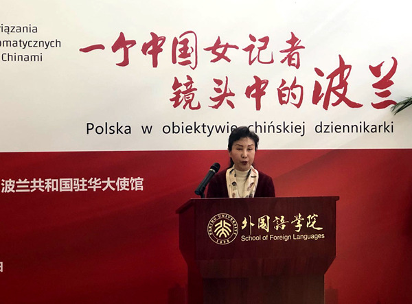 Du Jing delivers a speech at the opening ceremony of the“Poland through the lens of a female Chinese journalist” photo exhibition in Beijing, October 28, 2019. (People's Daily Online/Du Mingming)