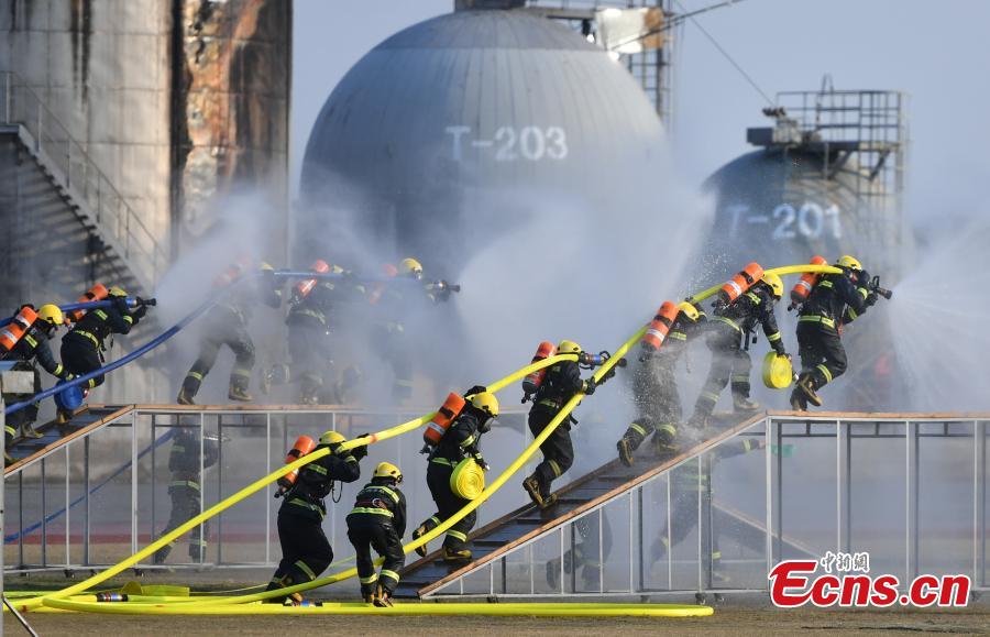 A fire drill to prepare for a potential blast at a chemical industrial plant in Shaoxing City, Zhejiang Province. (Photo: China News Service/Zhang Yin)