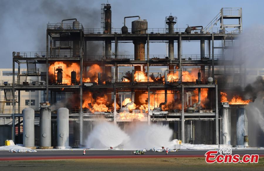 A fire drill to prepare for a potential blast at a chemical industrial plant in Shaoxing City, Zhejiang Province. (Photo: China News Service/Zhang Yin)