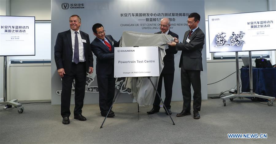 Guests unveil the Powertrain Test Center during the Changan UK Test Center Opening and New Engine Unveiling Ceremony in Birmingham, Britain, on Nov. 12, 2019. A world-class auto powertrain test center, invested by China's Changan Automobile, was unveiled Tuesday in the British industrial city of Birmingham despite continuing uncertainty caused by Brexit. (Xinhua/Han Yan)