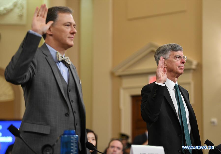 Charge d'Affairs of the U.S. Embassy in Ukraine William Taylor (R) and deputy assistant secretary of State for European and Eurasian affairs George Kent swear before the U.S. House Committee on Intelligence during the impeachment hearings on President Donald Trump on Capitol Hill in Washington D.C. the United States, Nov. 13, 2019. The U.S. House Committee on Intelligence held the first public hearing Wednesday since House Democrats launched an impeachment inquiry into President Donald Trump in September to determine whether he abused his office in his interactions with Ukraine. (Xinhua/Liu Jie)