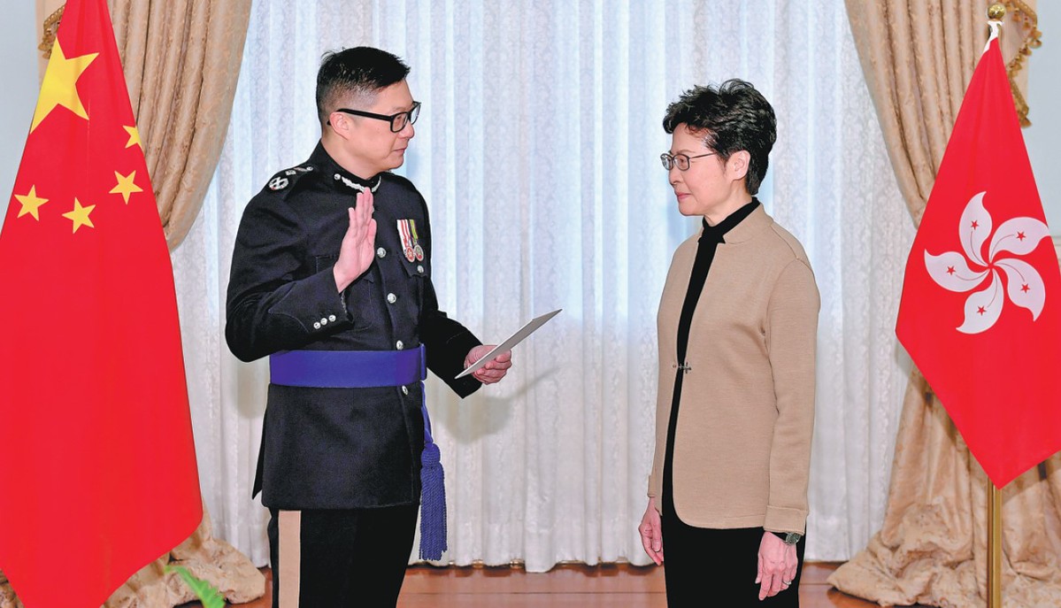 Carrie Lam Cheng Yuetngor, chief executive of the Hong Kong Special Administrative region, witnesses new Commissioner of Police Tang Pingkeung take his oath of office in Hong Kong on Tuesday. [PHOTO PROVIDED TO CHINA DAILY]