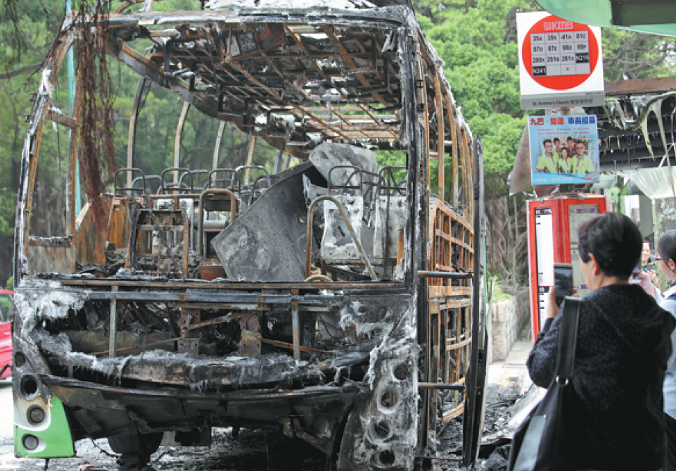 A bus stands gutted by fire in Tsim Sha Tsui, Hong Kong, on Monday. [PHOTO / CHINA DAILY]