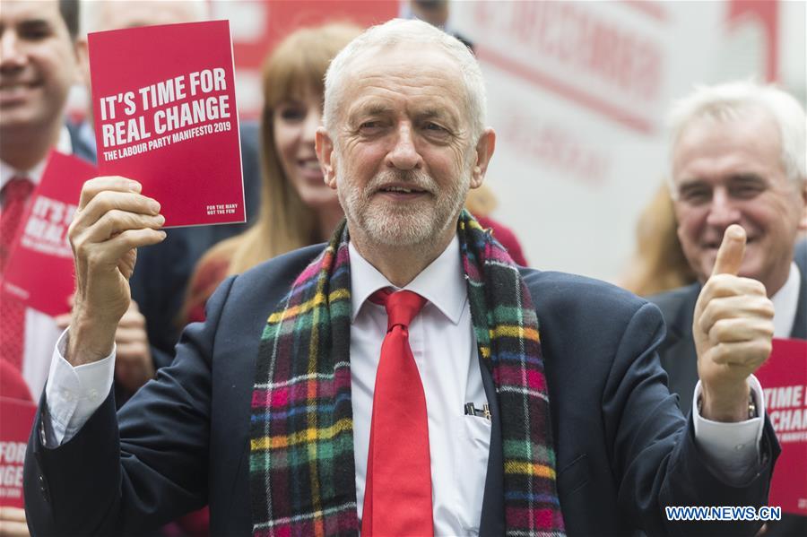 British Labour Party leader Jeremy Corbyn holds a copy of the party's election manifesto during its launch in Birmingham, Britain, on Nov. 21, 2019. The United Kingdom's (UK) main opposition Labour Party launched its election manifesto on Thursday that promises to ensure that higher earners pay more tax and to introduce a new second homes tax. (Photo by Ray Tang/Xinhua)