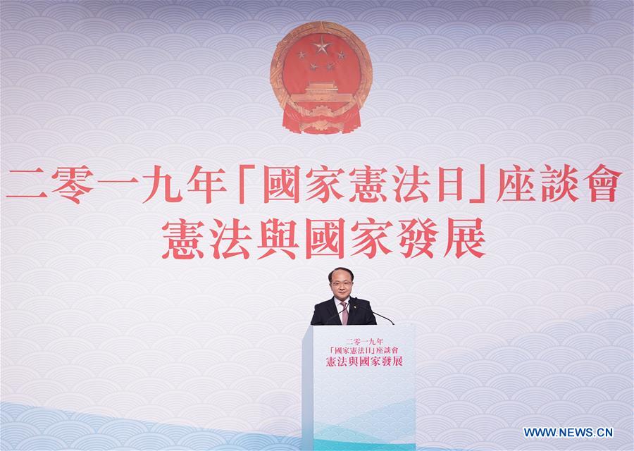Wang Zhimin, director of the Liaison Office of the Central People's Government in the Hong Kong Special Administrative Region, addresses a symposium to mark China's sixth Constitution Day, in south China's Hong Kong, Dec. 4, 2019. (Xinhua/Lui Siu Wai)