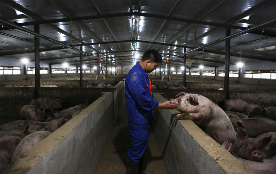 An employee conducts checks on pigs at a breeding facility in Deyang, Sichuan province.[Photo/Xinhua]