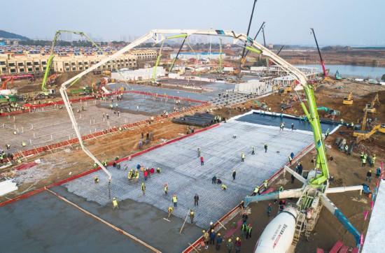 More than 4,000 workers and around 1,000 vehicles and large pieces of machinery have been toiling away at the Huoshenshan (Fire God Mountain) Hospital site day and night. Around 400 prefab rooms have been finished so far. The main pipeline of the drainage system in the hospital site is largely complete.