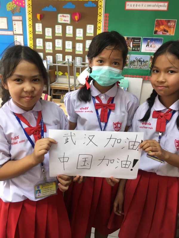 Thai students cheer China amid the ongoing battle against the coronavirus outbreak, holding a sign that reads, "Go Wuhan! Go China". (Photo provided by Sirinpun Yantarat)