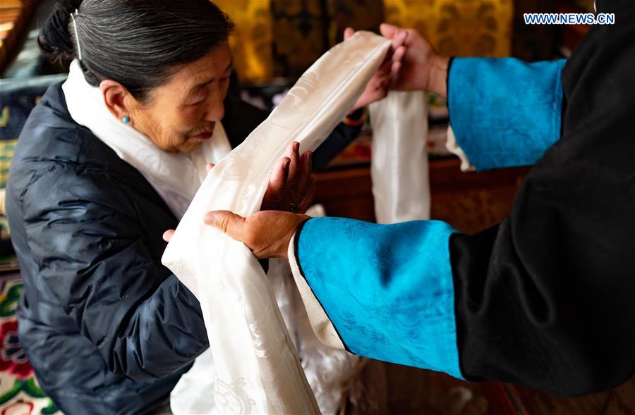 A resident presents a hada scarf to an elder to celebrate the Tibetan New Year in Lhasa, southwest China's Tibet Autonomous Region, Feb. 24, 2020. The Tibetan New Year, a traditional festival of the Tibetan ethnic minority, falls on Monday this year. China is in a tough battle against the novel coronavirus outbreak, which has claimed 2,592 lives and infected 77,150 on the Chinese mainland by the end of Feb. 23. Though Tibet only reported one confirmed case and has not seen new reports of the novel coronavirus infection for over three weeks, local authorities are still on high alert. Earlier on Feb. 19, authorities in Tibet called on citizens not to hold or participate in group activities during the Tibetan New Year. (Xinhua/Purbu Zhaxi)