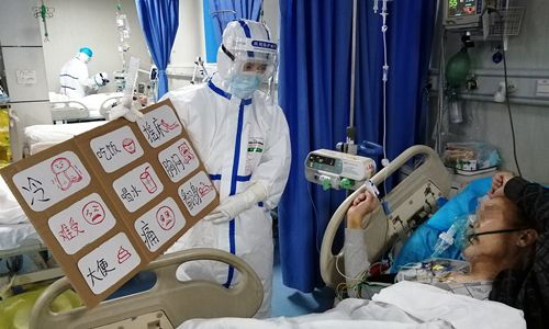 Chen Yuxi (left), a nurse from East China's Jiangxi Province who is supporting the battle against the epidemic in Wuhan, shows a paperboard with icons indicating eating, drinking and pain, to a critical patient on Monday. Chen made the board to help communicate with patients who have difficulty expressing their needs. Photo: cnsphoto