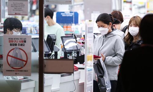 Local residents wait to pay at the counter in a shop in Seoul, South Korea, Feb. 24, 2020. South Korea confirmed 231 more cases of the COVID-19 on Monday, raising the total number of infections to 833, and the death toll rose to eight. The country raised its four-tier virus alert to the highest "red" level on Sunday as the virus infections soared for the past week. Photo: Xinhua