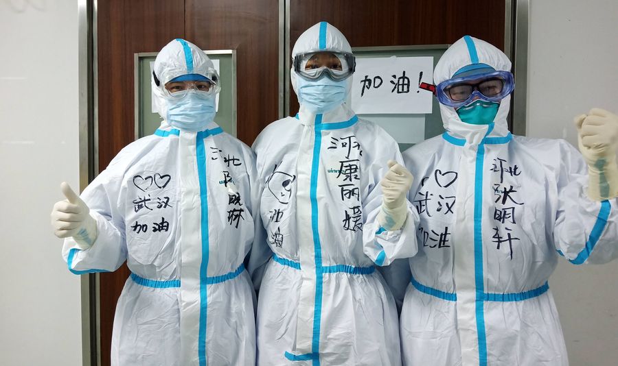 Medical workers cheer themselves up at the Intensive Care Unit of Wuhan No. 7 Hospital in Wuhan, central China's Hubei Province, Feb. 24, 2020. (Photo by Xiong Fang/Xinhua)
