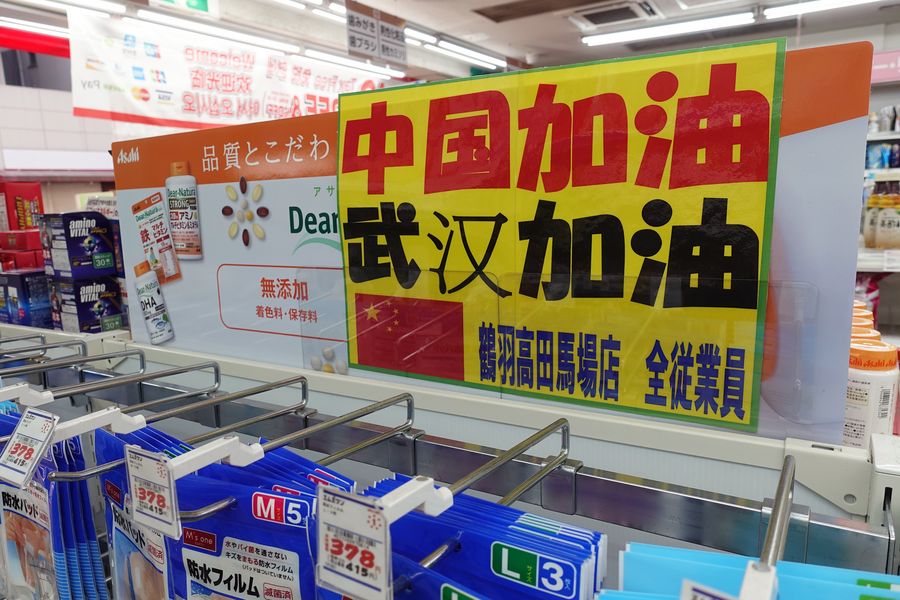 Photo taken on Feb. 11, 2020 shows a signboard conveying support to China in fighting the novel coronavirus epidemic at a store in Tokyo, Japan. (Xinhua/Du Xiaoyi)