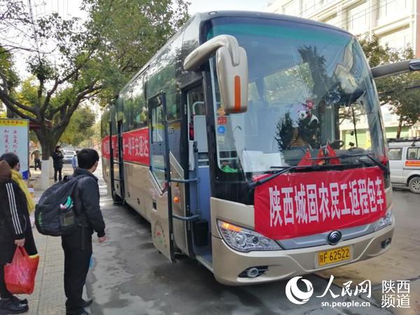 Migrant workers from Chenggu county in Shaaxi province board a chartered bus that will take them back to work in Zhejiang province. (Photo/People’s Daily Online)