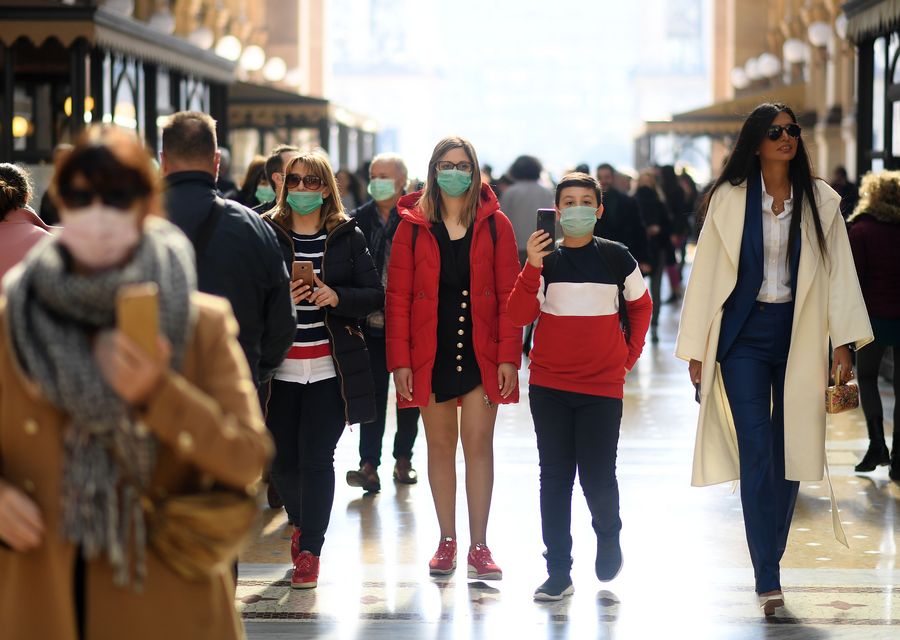 People wear masks as they walk in Milan, Italy, on Feb. 24, 2020. (Photo by Daniele Mascolo/Xinhua)