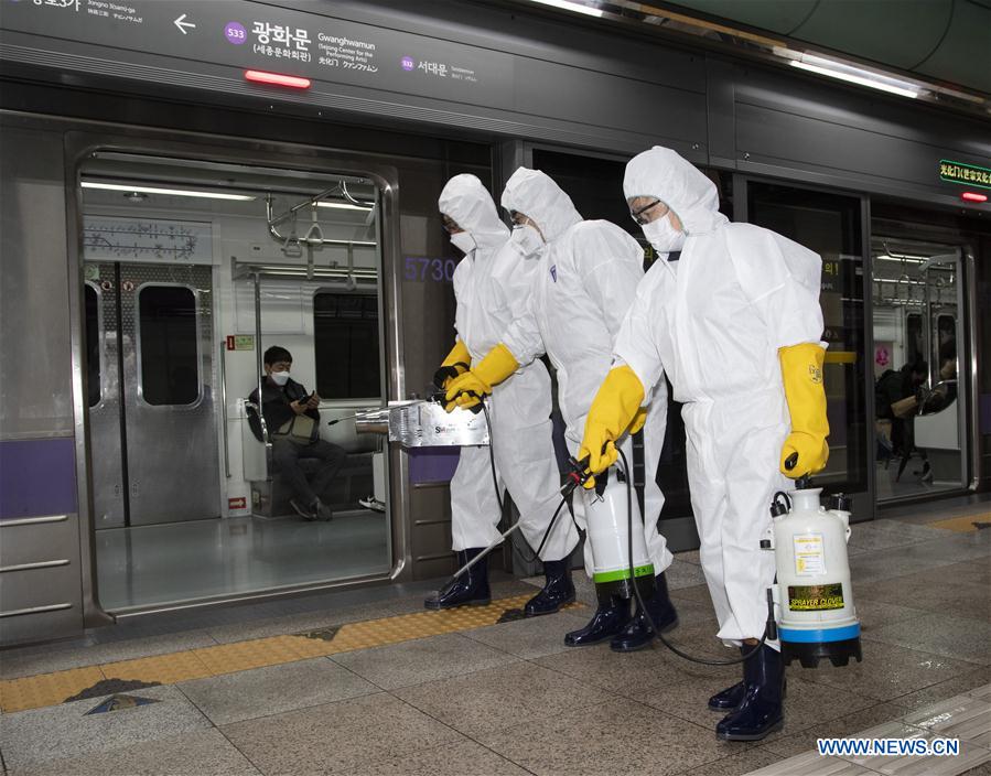 Staff members disinfect Gwanghwamun subway station in Seoul, South Korea, Feb. 28, 2020. South Korea confirmed 571 more cases of the COVID-19 on Friday, raising the total number of infections to 2,337. (Photo by Lee Sang-ho/Xinhua)