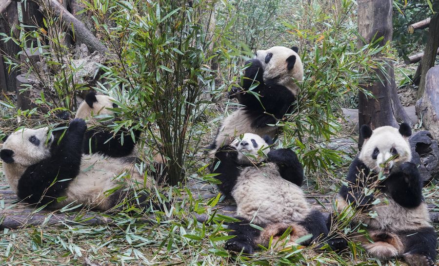 Giant pandas eat bamboo leaves at the Chengdu Research Base of Giant Panda Breeding in Chengdu, capital of southwest China's Sichuan Province, Jan. 1, 2020. (Photo by Chen Juwei/Xinhua)