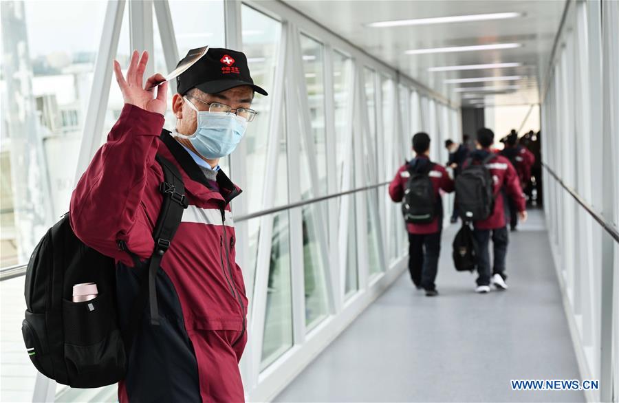 FUZHOU, March 25 (Xinhua) -- A team of 14 medical experts from east China's Fujian Province departed on a chartered flight to Italy on Wednesday morning to aid the European country's fight against the COVID-19 outbreak.