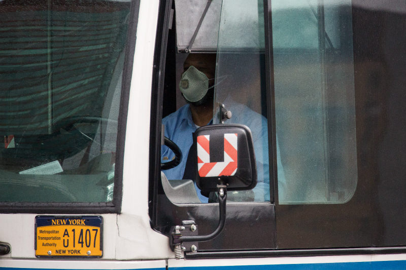 A bus driver wearing a face mask steers in the Brooklyn borough of New York, the United States, on April 3, 2020. (Photo by Michael Nagle/Xinhua)