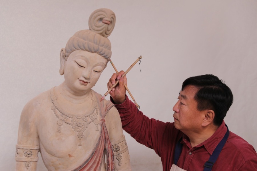 Painted sculpture artist Du Yongwei paints a sculpture in Dunhuang, Northwest China's Gansu province, April 5, 2020. Painted sculpture art is a traditional art form in Dunhuang and the craftsmanship has been inscribed in the provincial cultural heritage list of Gansu. Du Yongwei, 60, has been working in the field for over 40 years. He has started training class for youngsters to learn the art.[Photo/Xinhua]