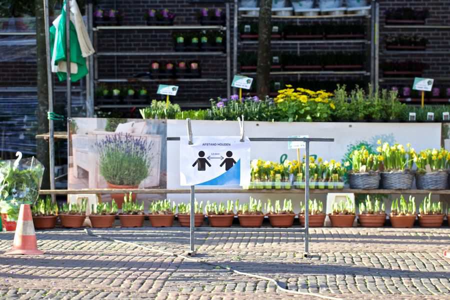 Signs and barriers noticing people to keep distance are seen at the Saturday market in Haarlem, the Netherlands, April 11, 2020.(Photo by Sylvia Lederer/Xinhua)