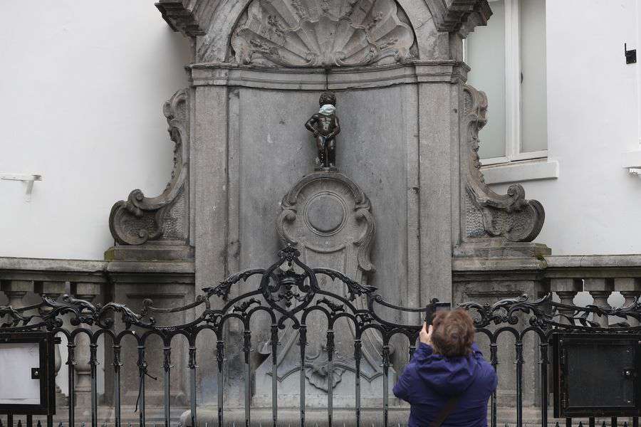 A woman takes photos of the Manneken Pis (Little Pissing Man) wearing a mask in Brussels, Belgium, April 13, 2020.(Xinhua/Zheng Huansong)