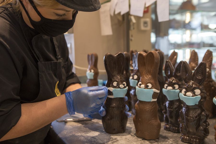 A pastry chef makes a "mask" for a chocolate Easter bunny in Athens, Greece, on April 12, 2020. (Xinhua/Marios Lolos)