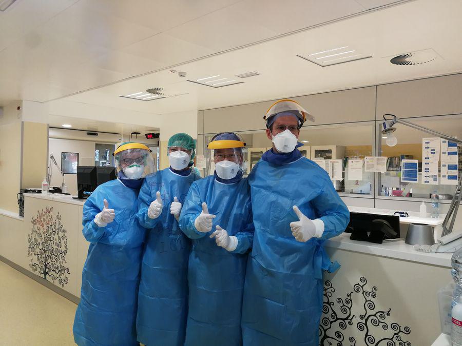 Chinese medical team experts and Italian doctors pose for a photo in Padua, Italy, March 18, 2020. (Chinese Medical Team/Handout via Xinhua)