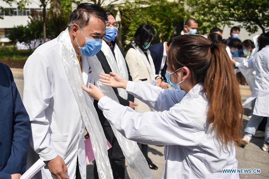 A medical student from Tibet University presents a hada scarf to Gu Jin, head of the Peking University Shougang Hospital, in Beijing, capital of China, April 24, 2020. A total of 17 medical students from Tibet University finished their 48-week clinical internship at the Peking University Shougang Hospital on Friday. (Xinhua/Peng Ziyang)