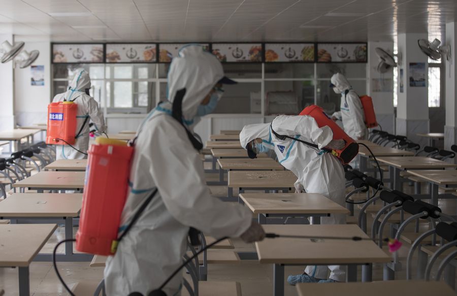 Firefighters disinfect the canteen in Wuhan No. 23 Middle School in Wuhan, central China's Hubei Province, April 22, 2020. (Xinhua/Fei Maohua)