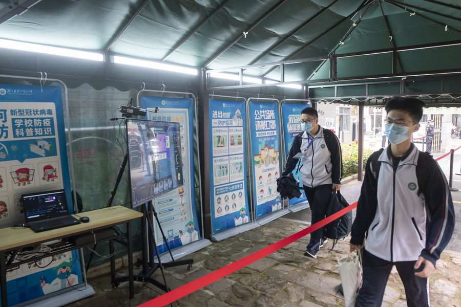 Senior students walk through a temperature measuring station to enter Hubei Wuchang Experimental High School in Wuhan, central China's Hubei Province, May 6, 2020. (Xinhua/Xiong Qi)