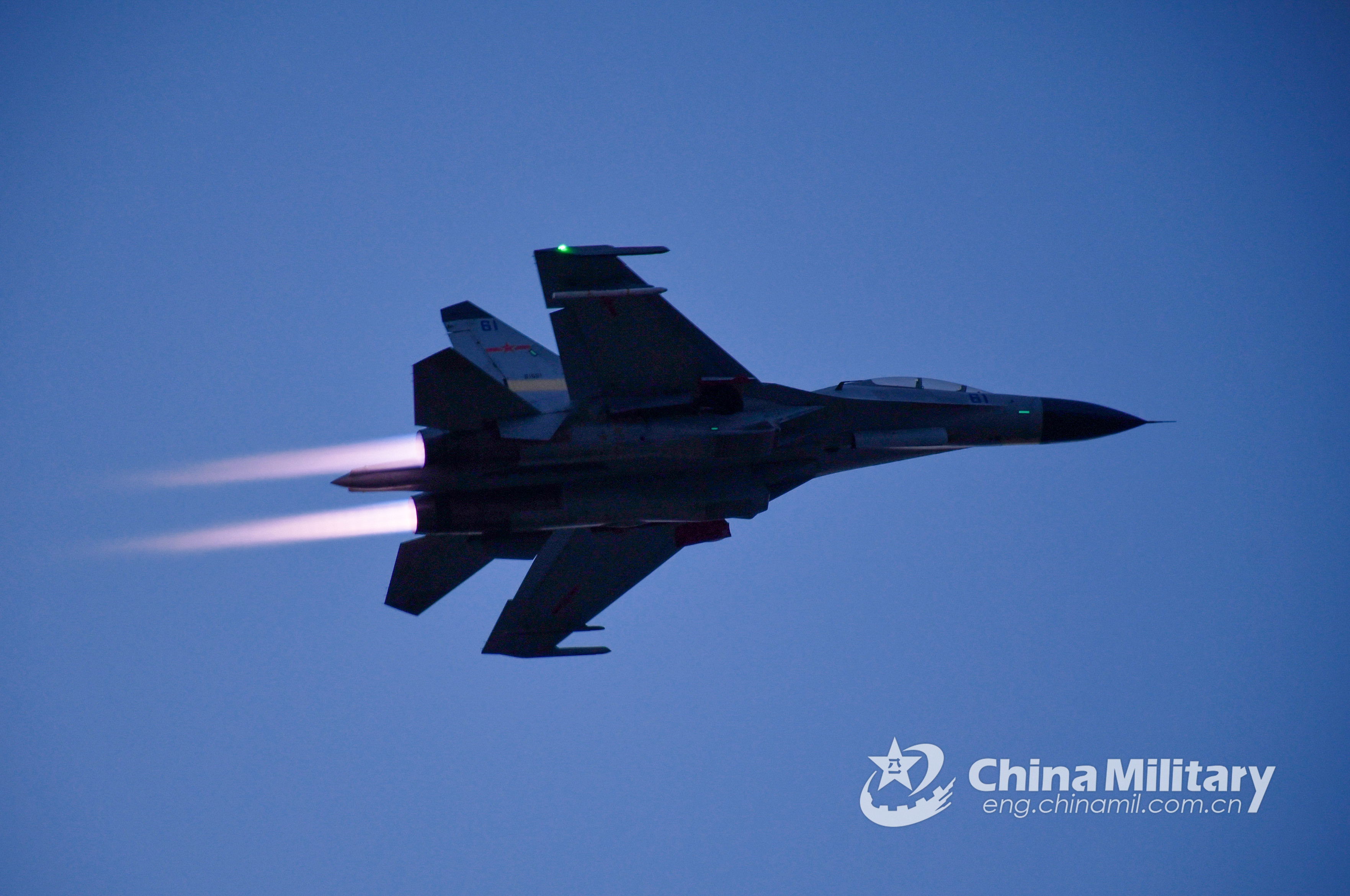 A fighter jet attached to an aviation regiment under the PLA Naval Aviation University soars into the air to designated space during a round-the-clock flight training course in mid-April, 2020. (eng.chinamil.com.cn/Photo by Gao Yuan)
