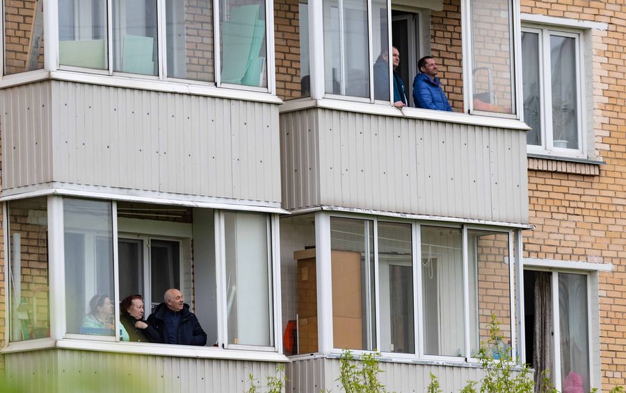 People watch the Victory Day Air Parade on their balconies at home in Moscow, Russia, May 9, 2020. (Xinhua/Bai Xueqi)