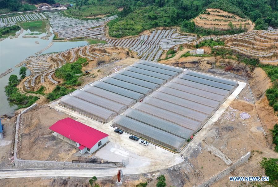 Aerial photo shows vegetable greenhouses at Tangwan Village of Chuanshan Town in Huanjiang Maonan Autonomous County, south China's Guangxi Zhuang Autonomous Region, May 12, 2020. In recent years, the autonomous county has stressed the development of collective economies in its villages, such as rural greenhouse economy, to help improve locals' incomes. (Xinhua/Lu Boan)