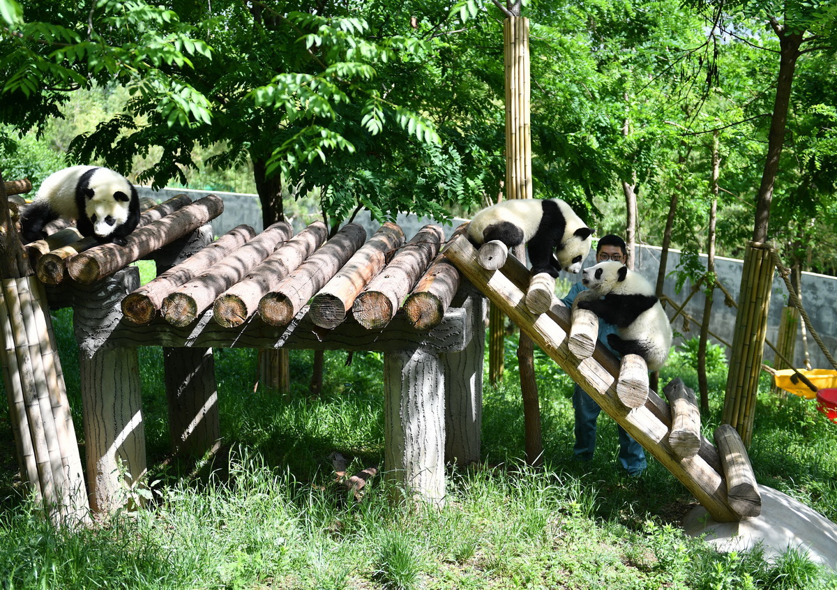 This photo taken on May 10, 2020 shows giant pandas at the Qinling giant panda research center in northwest China’s Shaanxi province. (Xinhua/Zhang Bowen)