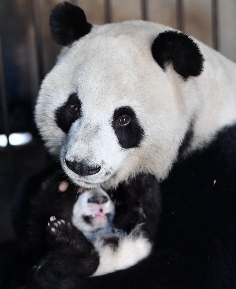 Giant panda Zhu Zhu takes care of her cub at the Qinling giant panda research center in northwest China’s Shaanxi province on Dec. 4, 2019. (Xinhua/Zhang Bowen)