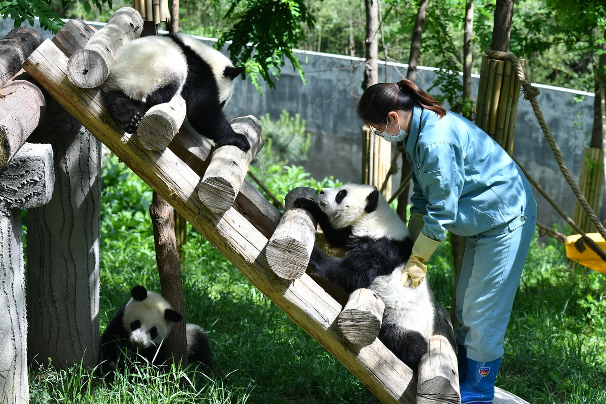 A member of staff interacts with giant pandas at the Qinling giant panda research center in northwest China’s Shaanxi province on May 10, 2020. (Xinhua/Zhang Bowen)