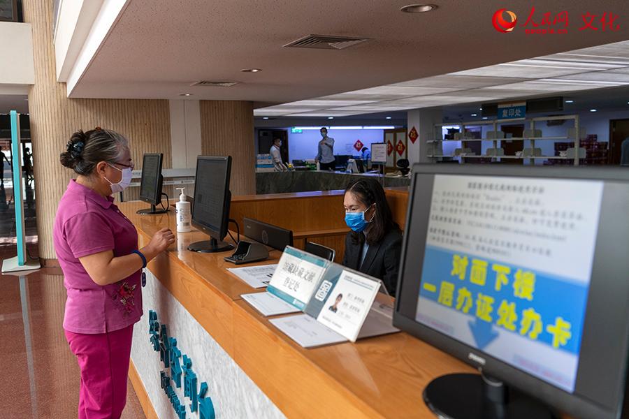 A reader consults a staff member about the procedure for borrowing books on May 12. (Photo/Weng Qiyu)