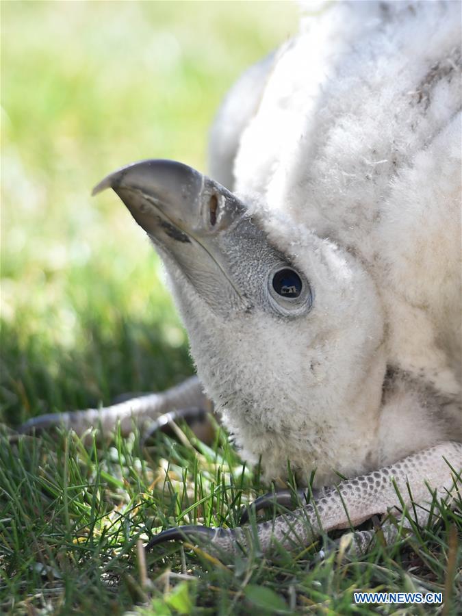 Photo taken on May 17, 2020 shows a captive-bred Himalayan vulture at the Xining Wildlife Park in Xining, northwest China's Qinghai Province. Two captive-bred Himalayan vultures made their public appearance at the Xining Wildlife Park on Sunday. The two baby birds, both in good physical conditions, are the third and fourth existing captive-bred Himalayan vultures across the country. (Xinhua/Zhang Long)
