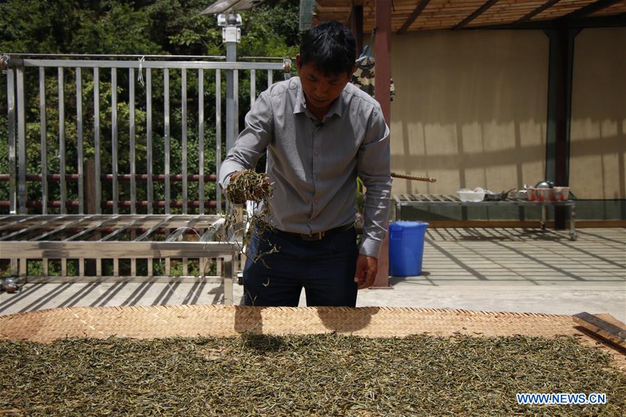 A local tea farmer dries tea leaves in Laobanzhang Village of Menghai County in Xishuangbanna Dai Autonomous Prefecture, southwest China's Yunnan Province, May 30, 2020. Menghai County is a famous Pu'er tea growing area with a long history of tea planting, making, using, drinking and trading. In Laobanzhang Village of Menghai County, some local tea farmers inherit and retain the traditional hand-made tea techniques. The hand-made tea produced by local farmers is popular in the market. (Xinhua/Wu Han)
