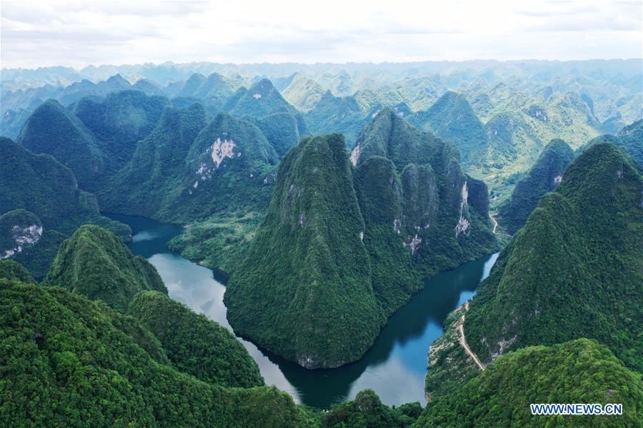 Aerial photo taken on May 22, 2020 shows a view of Dagou River in Xia'nan Township of Huanjiang Maonan Autonomous County, south China's Guangxi Zhuang Autonomous Region. Located in the northwestern part of Guangxi, Huanjiang Maonan Autonomous County is the only autonomous county for the Maonan ethnic group nationwide. The Maonan ethnic group is one of the country's 28 ethnic groups with a smaller population. About 70 percent of Maonan people, or 64,500, live in Huanjiang County. The poverty headcount ratio in Huanjiang dropped to 1.48 percent by the end of last year. The county was removed from the country's list of impoverished counties in May. Based on the Maonan people's poverty alleviation situation across the country, the ethnic group has gotten rid of poverty as a whole. (Xinhua/Lu Boan)
