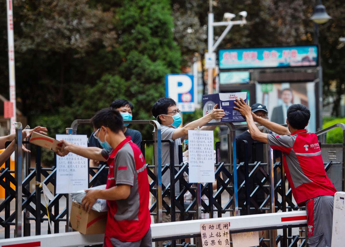 Delivery workers hand parcels to people in a residential compound in Beijing's Xicheng district on Wednesday. Restrictions on access to all communities have resumed as the city increased the level of its COVID-19 emergency response. CHEN ZHONGHAO/XINHUA