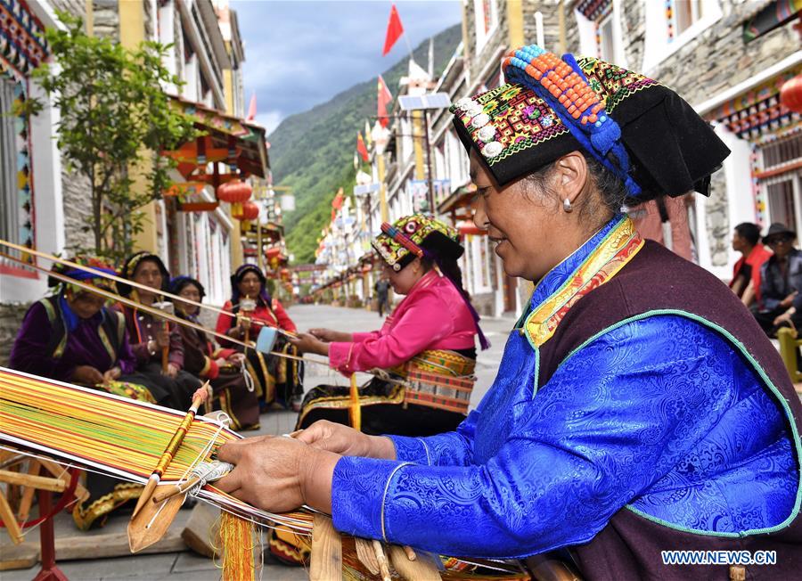 Villagers weave traditional belts in Lixian County of Aba Tibetan and Qiang Autonomous Prefecture, southwest China's Sichuan Province, June 11, 2020. Located in northwest of Sichuan Province, with nearly one million population, Aba Tibetan and Qiang Autonomous Prefecture has a diversity of ethnic minority groups, including Tibetan, Qiang and Hui, etc. In recent years, to better inherit the ethnic culture, local schools have introduced more traditional cultural courses while local authorities set up training workshops about intangible cultural heritage to help local villagers learn traditional crafts, as a way to boost their incomes. In 2018, the production value of cultural industry in this prefecture has reached about 1.2 billion yuan (about 169.8 million U.S. dollars), accounting for 3.32 percent of gross domestic product (GDP) of this prefecture. (Xinhua/Liu Kun)