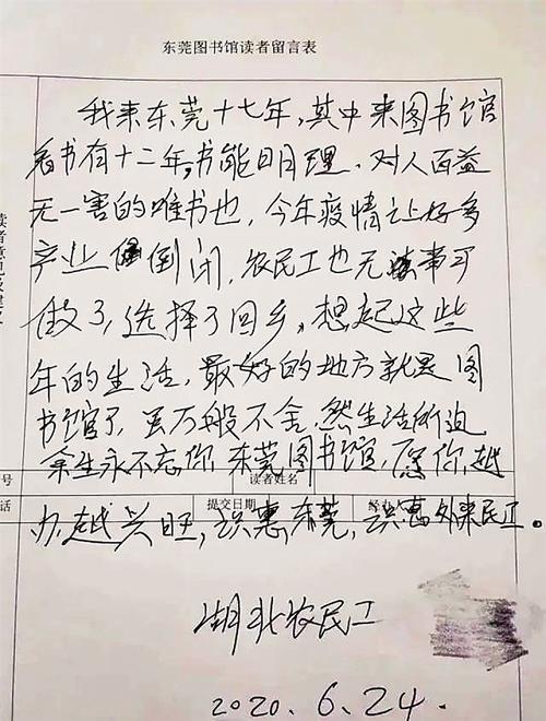 Wu Guichun leaves a thank you note at a library in Dongguan, southern China’s Guangdong province.