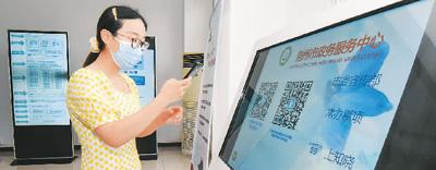 A resident scans a QR code to learn about administrative review and approval procedures at the government service center in Jingzhou, central China’s Hubei province. (Photo/Huang Zhigang)