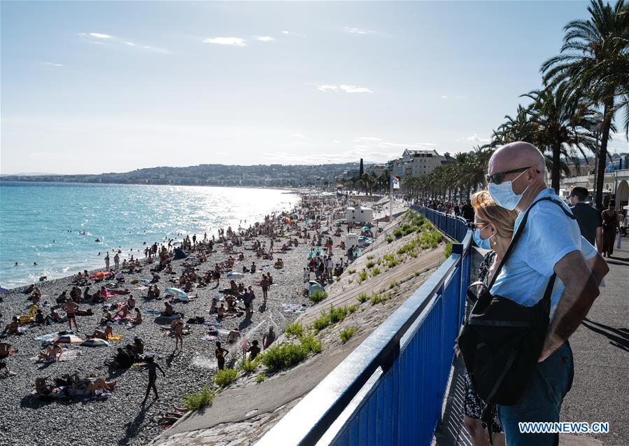 People wear masks while enjoying the sea in Nice, southern France, Aug. 4, 2020. Amidst fears of a second pandemic wave, France has made wearing mask compulsory in busy pedestrian streets and uncovered markets in addition to tourists spots in many cities, including Lille, Nice and La Mayenne. (Photo by Serge Haouzi/Xinhua)
