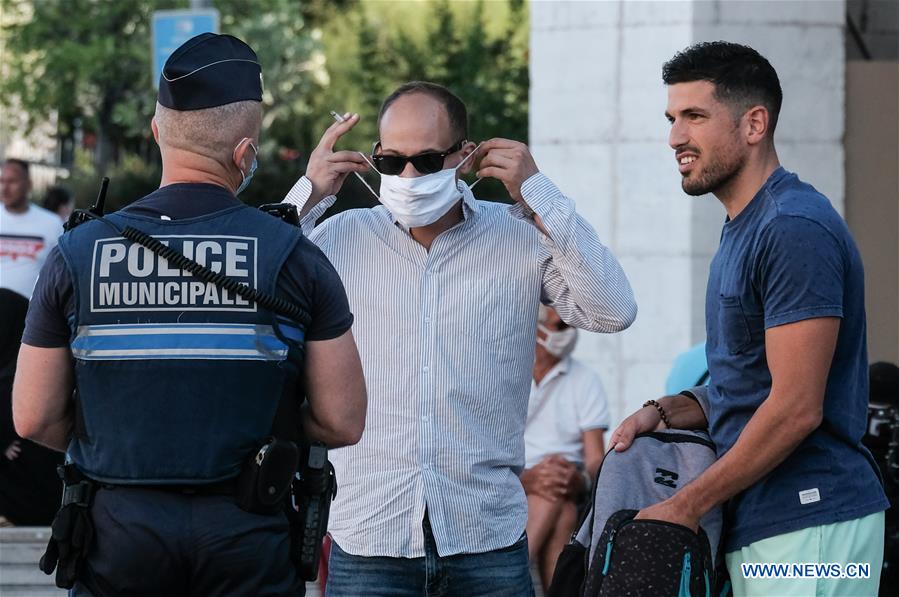 A policeman patrols to inform people to wear masks in Nice, southern France, Aug. 4, 2020. Amidst fears of a second pandemic wave, France has made wearing mask compulsory in busy pedestrian streets and uncovered markets in addition to tourists spots in many cities, including Lille, Nice and La Mayenne. (Photo by Serge Haouzi/Xinhua)