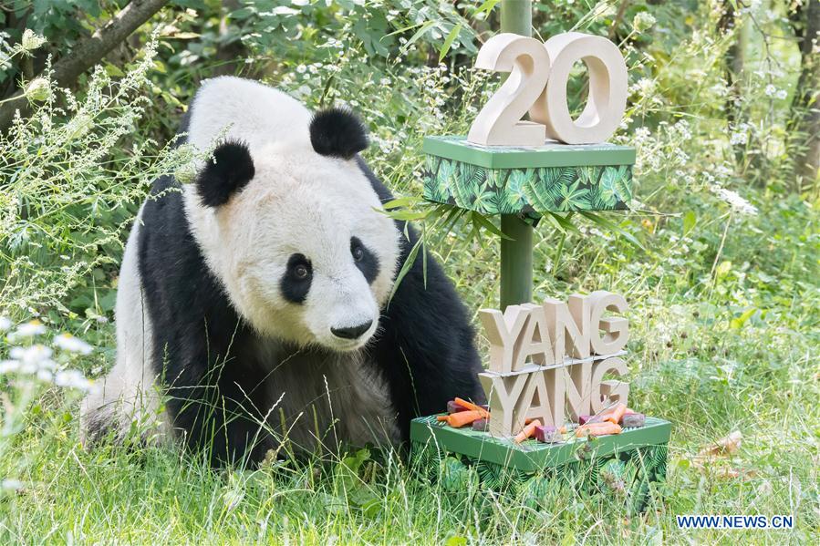 Giant panda Yang Yang looks at food in the celebration of its 20th birthday at Schonbrunn Zoo in Vienna, Austria, Aug. 9, 2020. (Daniel Zupanc/Schonbrunn Zoo/Handout via Xinhua)