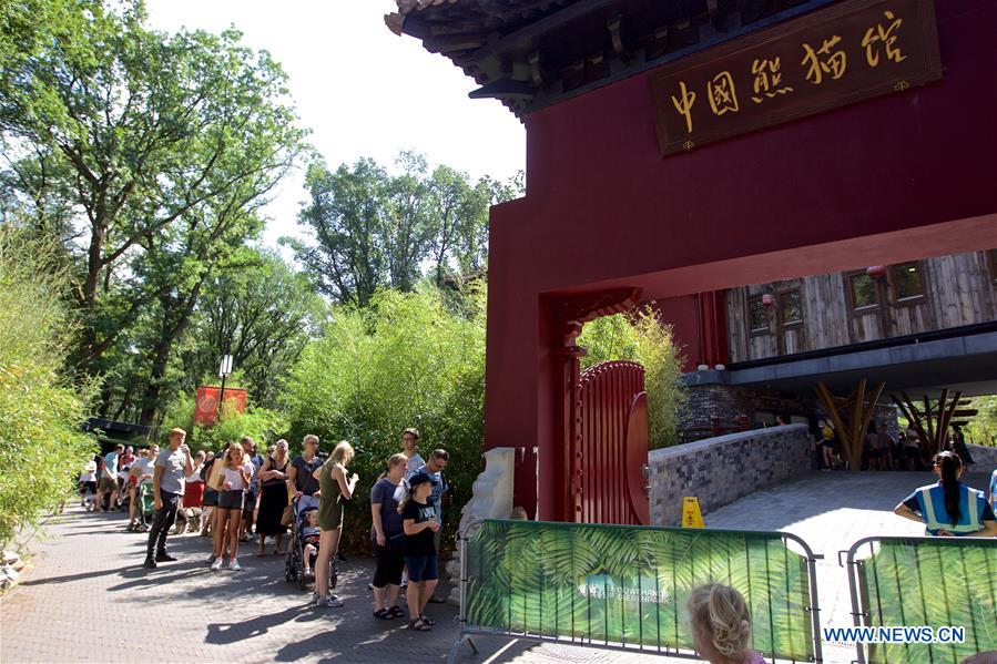 Visitors queue to view Xing Ya, father of the giant panda cub Fan Xing, at Ouwehands Zoo in Rhenen, the Netherlands, Aug. 14, 2020. The giant panda cub, born on May 1 in the Dutch Ouwehands Zoo, has been named Fan Xing, the zoo announced on Friday. (Photo by Sylvia Lederer/Xinhua)
