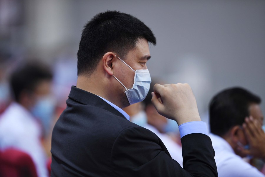 Chinese Basketball Association chairman Yao Ming looks on during the third game of the 2019-20 CBA finals between Guangdong Southern Tigers and Liaoning Flying Leopards in Qingdao, Aug. 15, 2020. (Xinhua/Li Ziheng)